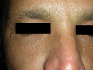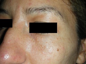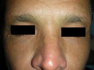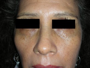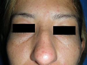 Caso 2, Foto Nº1 Lesiones de 1 – 2mm en párpados inferiores. Evolución crónica