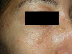 Caso 3, Foto Nº1 Lesiones de 1-3 mm en párpados inferiores. Evolución crónica.